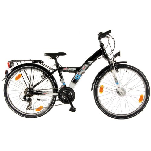 Das Kid Chaser Draco Y-Banana - das ist Fahrspaß auf zwei Reifen für unsere kleinen Fahrradfahrer. Das kindgerecht gestaltete Fahrrad besitzt einen 24-Zoll großen Y-Rahmen, der aus Aluminium gefertigt wurde. Um mit dem Fahrrad auch mal richtig schnell fahren zu können, verfügt es über eine Shimano 21-Gang XT35 Kettenschaltung. Eine vollständige StVZO Ausstattung beruhigt wohl nicht nur die Eltern der Kids, sondern erfreut mit Sicherheit auch die Kinder. Denn dank eines Shimano Nabendynamos, eine