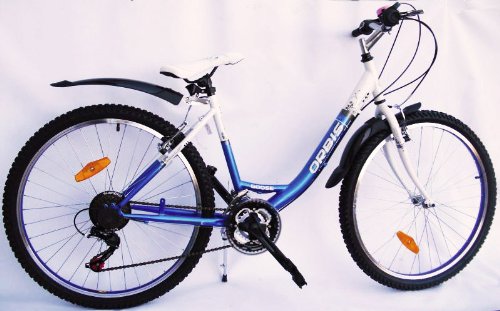 Maße: Rahmenhöhe: 40cm - Von Boden bis Sattel: 70cm (+8cm verstellbar) - Lenkerhöhe: 95cm (+5cm verstellbar) - Hergestellt nach EU NORM DIN79110 - 85 % vormontiert Sattel und Lenkstange höhenverstellbar - Schnellspannverschlusss Sattel - Shimano Revo 18-Gang Drehgriffschaltung - 18 Shimano Gang Kettenschaltung- Seitenständer ( verstellbar), Klingel 26 Zoll Mädchenfahrrad Mountainbike Damenfahrrad 18 Gang - Reifengröße: 26" - Farbe: BLAU / Weiss - Neuware & OVP Mit tiefem Einstieg - Vorder und Hinterradbremse -2 Handbremsen aus ALU - ALuminium Felgen-Schutzblech hinten & vorne - LED Lampe für vorne und hinten